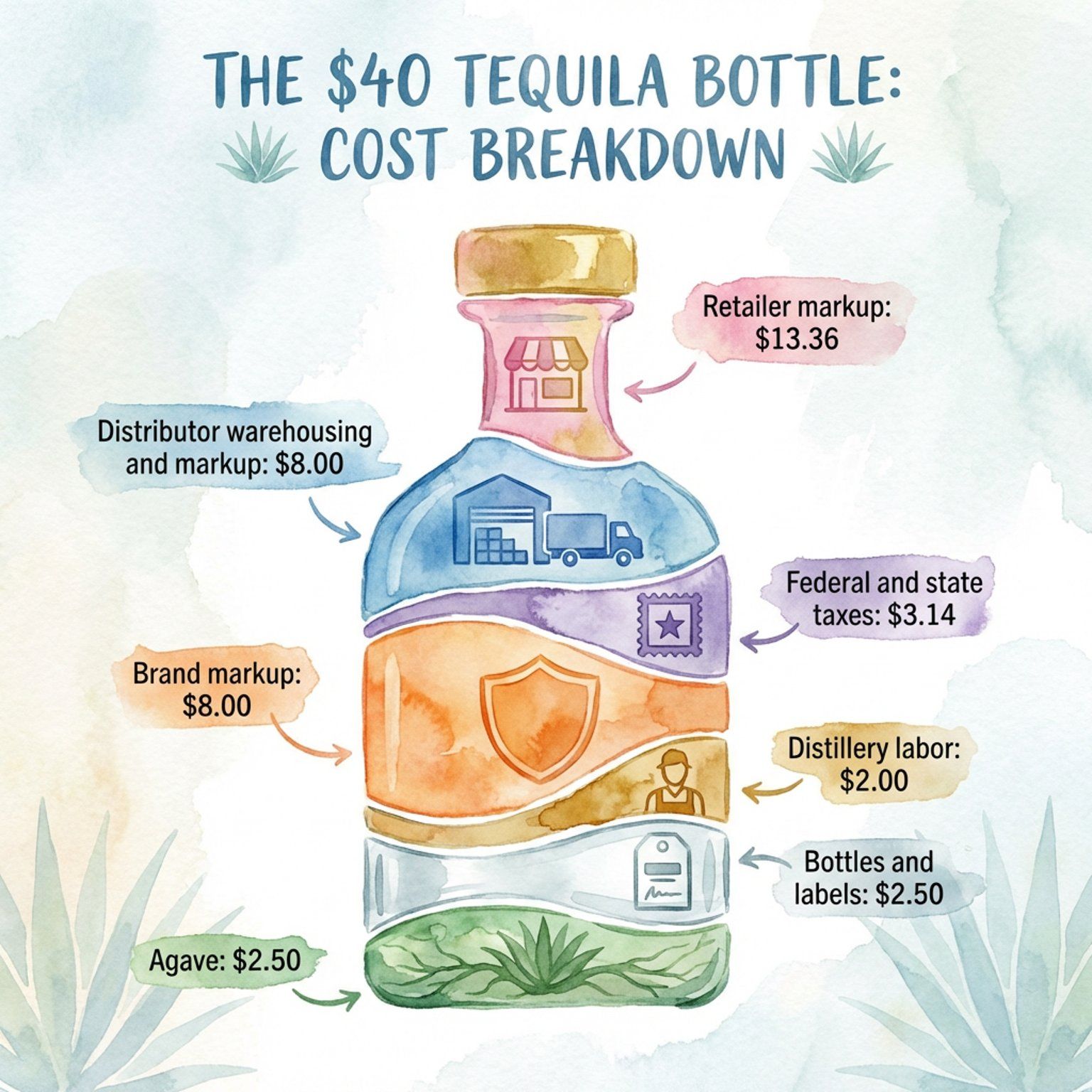 The price you see on the shelf is not an agave price; it’s a "stack price." This stack includes fixed and rising costs for dry goods, a currency fluctuation "gut punch," federal and wildly varying state excise taxes that get heavily multiplied by distributor and retailer margins, and the several dollars per bottle needed just for marketing.